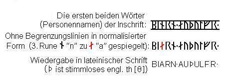 Die verwendete Schrift ist die jüngere Runenreihe (jüngeres Futhark) mit 16 Zeichen. Hier ein Hinweis zur Lesung: